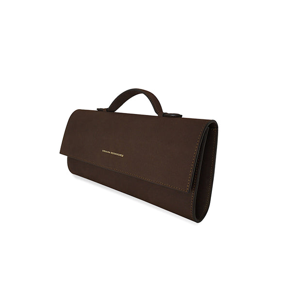 -CHOCOLATE SUEDE LEATHER (COW) -GOLD HARDWARE -FULLY LINED ON ECRU TWILL-MAGNETIC-FASTENING FRONT FLAP, TOP HANDLE-DESIGNER TAG