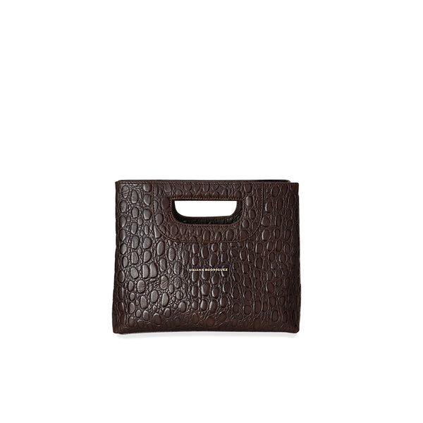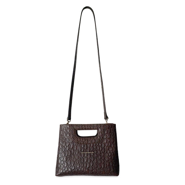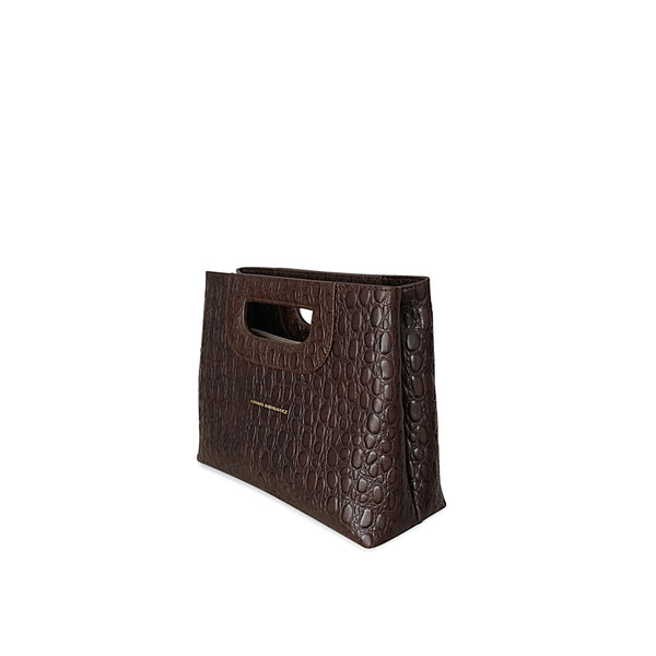 -CHOCOLATE TEXTURED LEATHER (COW)-TOP HANDLE, DESIGNER TAG-2 INTERNAL ZIP-FASTENING POCKETS-FULLY LINED ON ECRU TWILL
