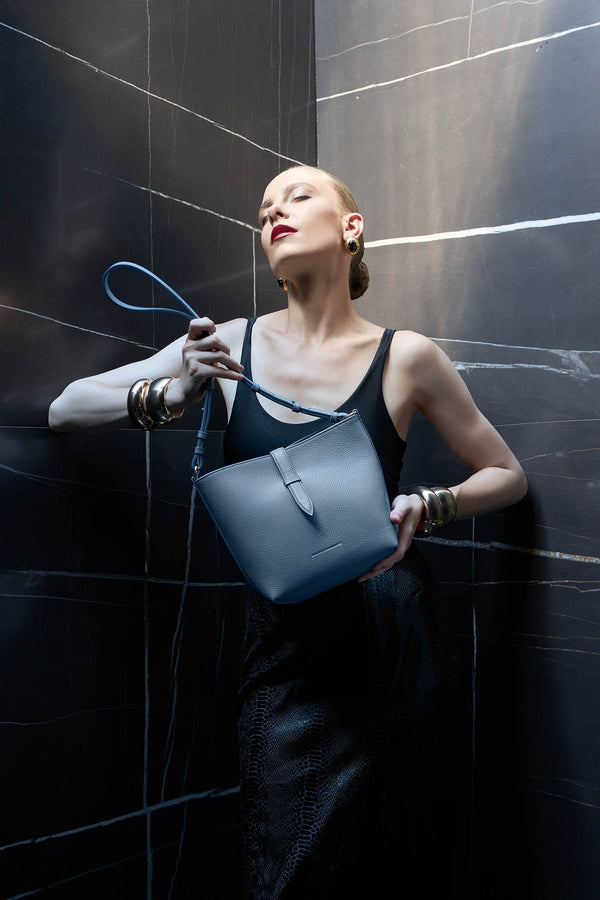 -LIGHT BLUE TEXTURED LEATHER-GOLD HARDWARE -FULLY LINED ON ECRU TWILL-INTERNAL ZIPPED POCKET-COMES WITH DUST BAG-DESIGNER TAG