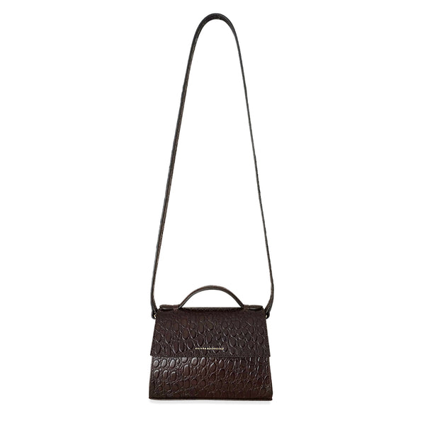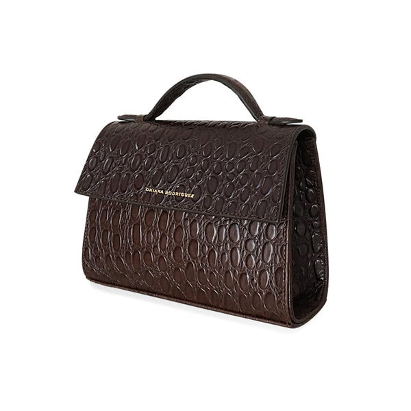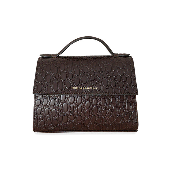 -CHOCOLATE TEXTURED LEATHER (COW) -GOLD HARDWARE -FULLY LINED ON ECRU TWILL-MAGNETIC-FASTENING FRONT FLAP, TOP HANDLE-REMOVABLE STRAP-DESIGNER TAG